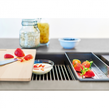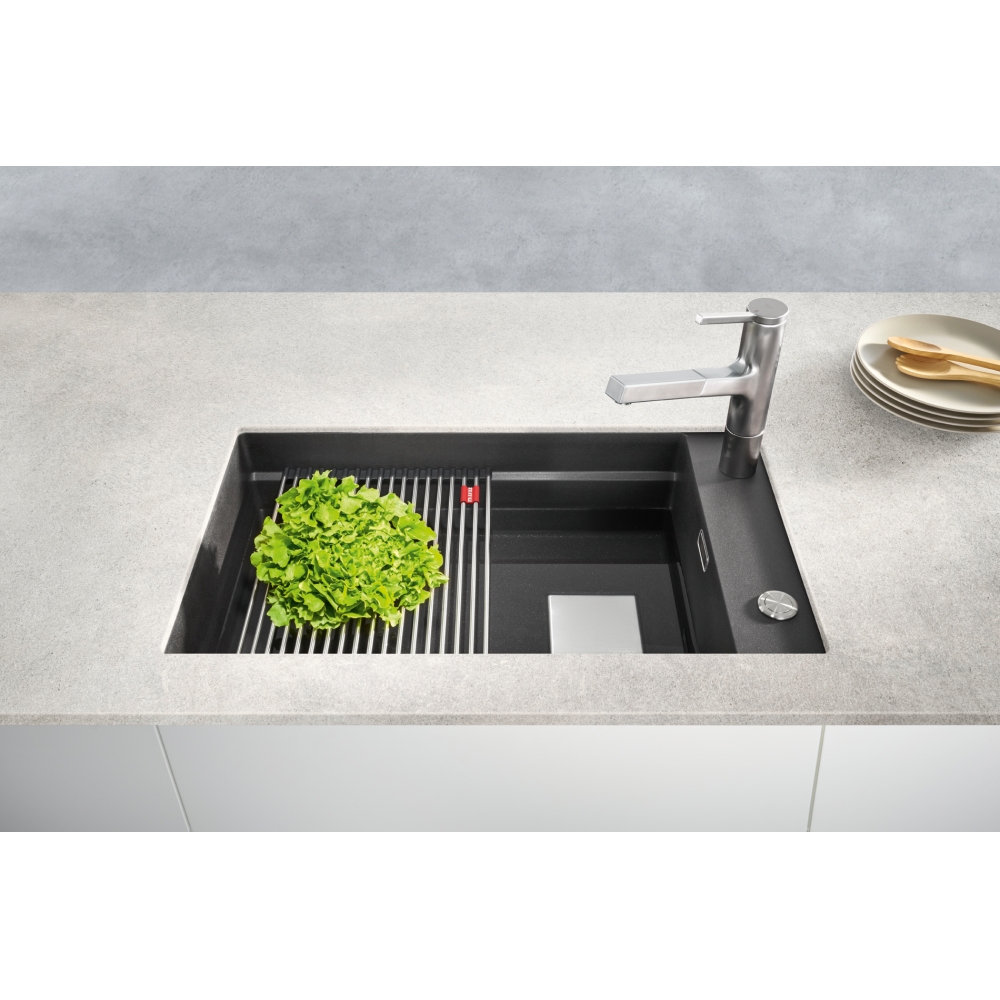 Fragranitový dřez Kubus 2. Cena zahrnuje: Easy Click sítkový ventil 3 1/2“ s přepadem a nerezovou krytkou ventilu. Dřez je bez sifonu. 2 Místa pro vyvrtání otvoru. V ceně dřezu doplňky: miska, přípravná deska a rolovací rošt.