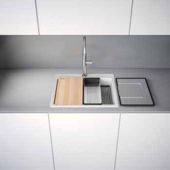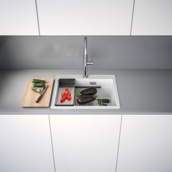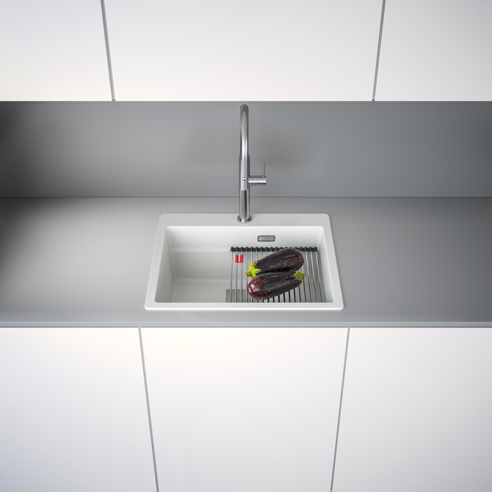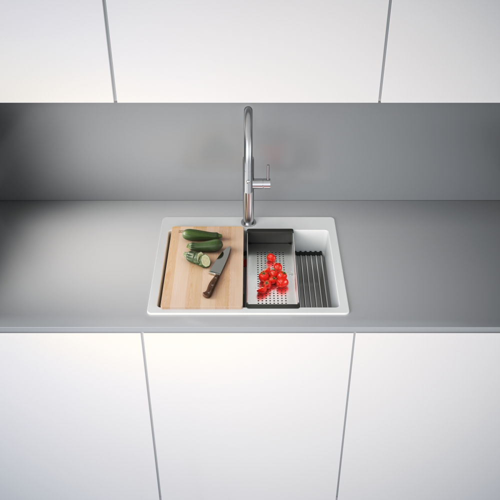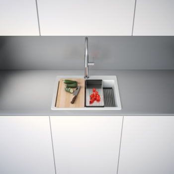Fragranitový dřez Kubus Pro. Cena zahrnuje: Sítkový ventil 3 1/2“ s přepadem a nerezovou krytkou ventilu. Sifon pro úsporu místa 6/4 “ s odbočkou na myčku nádobí. 3 Místa pro vyvrtání otvoru. Možnost umístit dávkovač saponátu. V ceně dřezu doplňky: miska, přípravná deska a rolovací rošt.