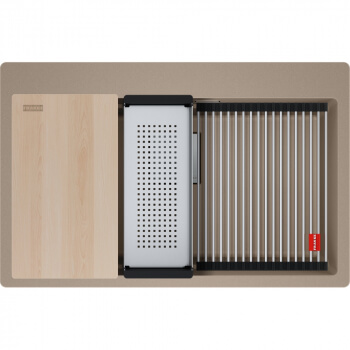 Fragranitový dřez Kubus Pro. Cena zahrnuje: Sítkový ventil 3 1/2“ s přepadem a nerezovou krytkou ventilu. Sifon pro úsporu místa 6/4 “ s odbočkou na myčku nádobí. 3 Místa pro vyvrtání otvoru. Možnost umístit dávkovač saponátu. V ceně dřezu doplňky: miska, přípravná deska a rolovací rošt.