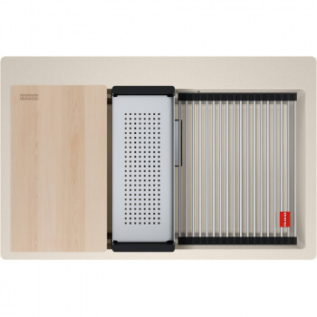 Fragranitový dřez Kubus Pro. Cena zahrnuje: Sítkový ventil 3 1/2“ s přepadem a nerezovou krytkou ventilu. Sifon pro úsporu místa 6/4 “ s odbočkou na myčku nádobí. 3 Místa pro vyvrtání otvoru. Možnost umístit dávkovač saponátu. V ceně dřezu doplňky: miska, přípravná deska a rolovací rošt.